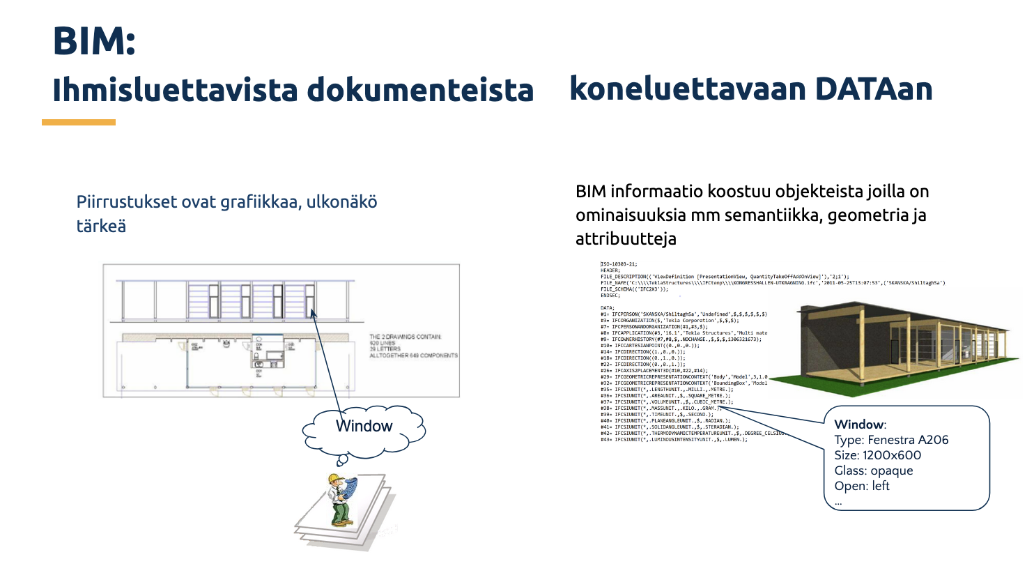 BIM eli rakennustiedon mallinnus on digitaalinen työnkulku, joka mahdollistaa rakennuksen suunnittelun, rakentamisen ja hallinnan tietomalleilla. Nämä mallit voivat sisältää geometriaa, attribuutteja ja semantiikkaa eli käsitteitä, jotka kuvaavat rakennuksen osia ja niiden suhteita toisiinsa.