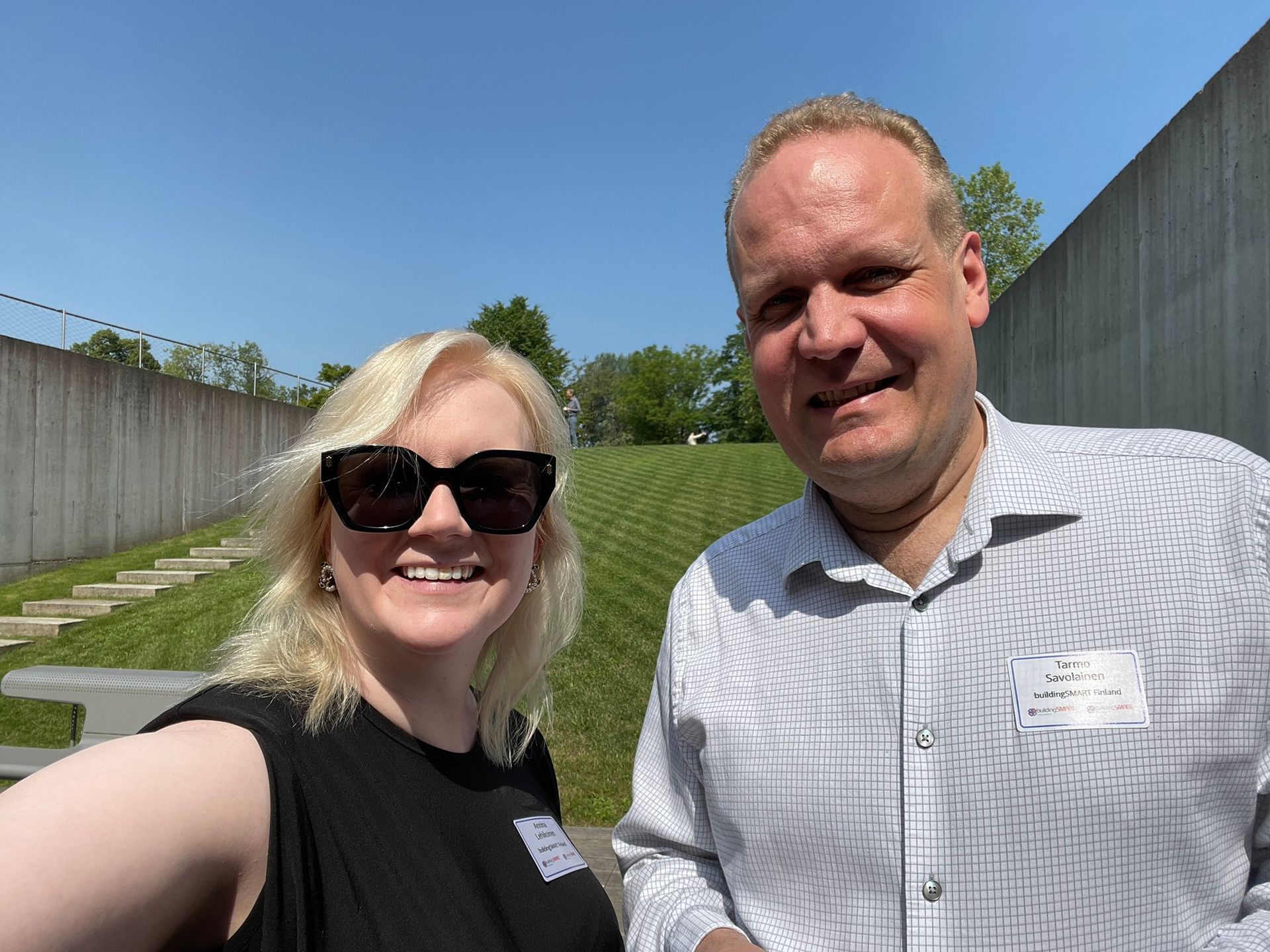 Annina ja Tarmo nauttimassa kesäauringosta buildingSMART International Summitissa, Sloveniassa.