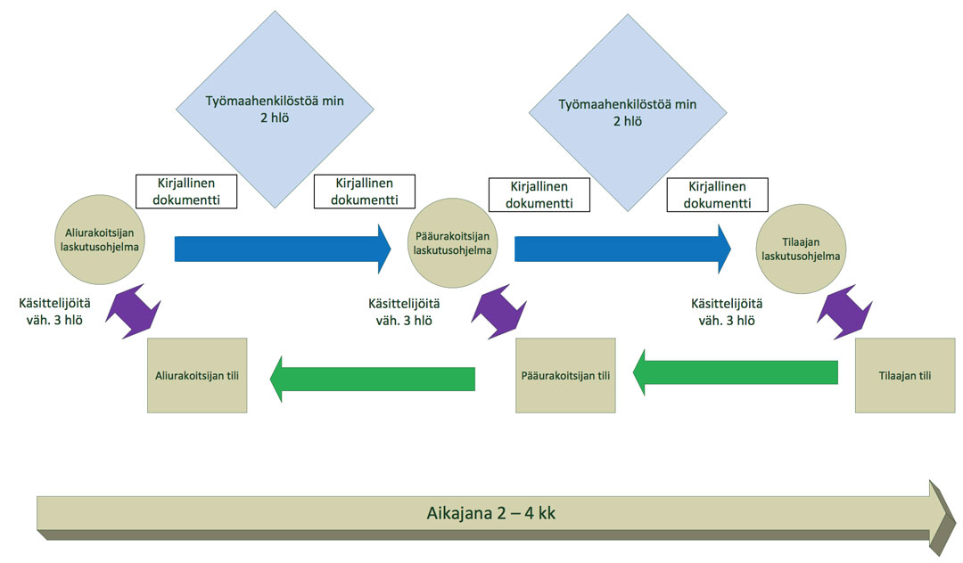 Käytännössä laskutusprosessi tapahtuu tänä päivänä seuraavasti. Laskutettava summa sovitaan joko suullisesti tai kirjallisesti sopimuksessa. Tehdyn työn suorite kirjataan työmaalla joko suoriteilmoitukseen, työmaapäiväkirjaan tai työmaakokouksen pöytäkirjaan. Tämän jälkeen suoritteen mukainen työ laskutetaan palveluntuottajan laskutusjärjestelmässä, joka on tavallisesti erillinen ohjelmisto. Järjestelmään lasku joudutaan tekemään projektihenkilöresurssin toimesta manuaalisesti. Järjestelmässä lasku sitten lähtee laskujen käsittelijän kautta laskutukseen. Tämän jälkeen lasku tulee pääurakoitsijan laskutusjärjestelmään, jossa lasku tarkastetaan ja hyväksytään yrityksen toimintaprosessin mukaisesti. Tämän jälkeen lasku maksetaan pankkitililtä toiselle nimetyn henkilöresurssin toimesta. Tässä vaiheessa suoritteen mukainen työ on saatu maksuun aliurakoitsijalle. Tämän jälkeen, jos kyseessä on lisä- tai muutostyö, kustannusta aletaan laskuttamaan tilaajalta. Tässä tapauksessa suorite käydään lävitse työmaakokouksessa, jossa lasku todetaan laskutuskelpoiseksi. Kun työmaapöytäkirja on saatu allekirjoitettua osapuolten kesken voi pääurakoitsija laittaa suoritteen laskutettavaksi omaan laskujen käsittelyohjelmaan, jossa laskun valmistelee urakoitsijan projektihenkilökunta, josta se siirtyy laskujen tekijälle. Tämän jälkeen lasku lähtee tilaajalle. Tilaajalla on tietenkin oma sähköinen laskujen käsittelyohjelma, johon lasku lopulta tulee ensin tarkastettavaksi ja tämän jälkeen hyväksyttäväksi, jonka jälkeen lasku lopulta maksetaan pääurakoitsijan tilille. Käytännössä tähän prosessiin on saatu kulumaan aikaa helposti 1 – 4 kk ja sidottua 13 – 20 henkilöä prosessin läpiviemiseen.