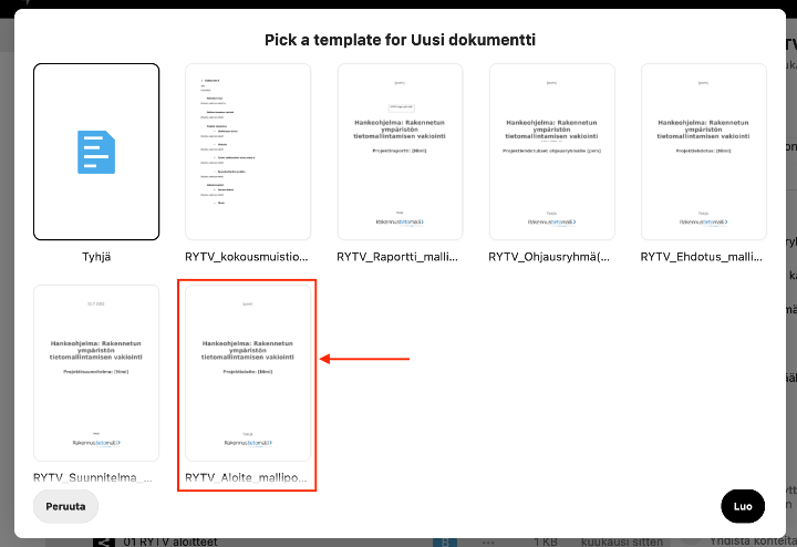 Projektialoitetta varten on oma mallipohja bSF Drivessa. Mallipohjan saat käyttöösi, kun luot uuden dokumentin ja valitset RYTV_Aloite_mallipohjan -templaten.