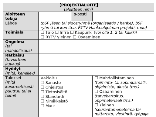 Jos haluat ehdottaa projektialoitetta, mutta yrityksesi ei ole buildingSMART Finlandin jäsen, ladattava mallipohja löytyy uutisen lopusta. Täytetty projektialoite tulee lähettää bSF toimistolle (yhteystiedot alla).
