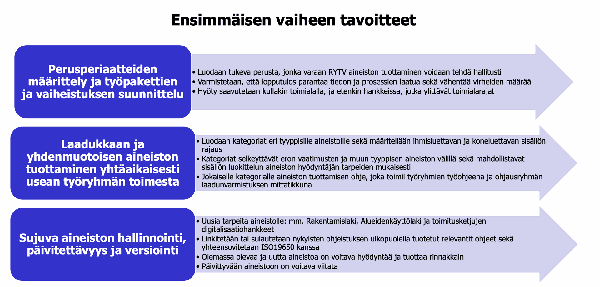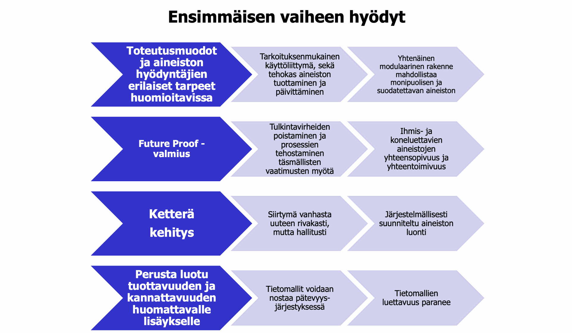 Kuvassa 1. tuodaan esille alustava esitys projektin vaiheistuksesta. Kuvassa 2. ja 3. kerrotaan tarkemmin ensimmäisen vaiheen tavoitteita ja hyötyjä.