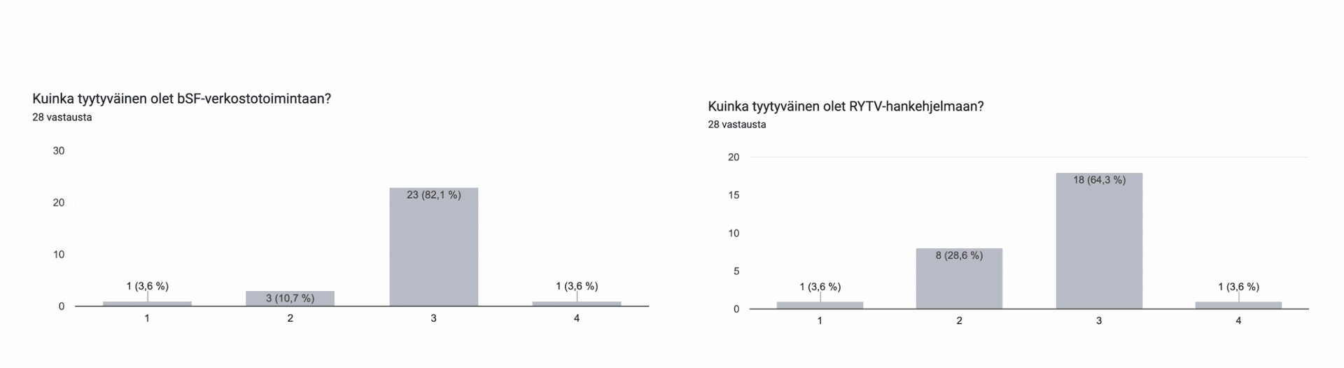 Kyselyssä tiedusteltiin miten tyytyväisiä vastaajat ovat bSF-verkostotoimintaan sekä RYTV-hankeohjelman toimintaan. Kuvassa 2. esitellään vastaukset näihin kysymyksiin. Vastauksista selviää, että suuri osa koki toiminnan sekä RYTV-hankeohjelmaan tyytyväisyyden arvosanalla 3. Asteikkona oli 1-4, jossa 1=ei lainkaan tyytyväinen ja 4=erittäin tyytyväinen. Yksittäisiä vastauksia myös löytyi, joissa oltiin erittäin tyytyväisiä tai ei lainkaan tyytyväisiä. RYTV-hankeohjelman osalta oli useampi, jotka arvioivat tyytyväisyytensä arvosanalla 2.