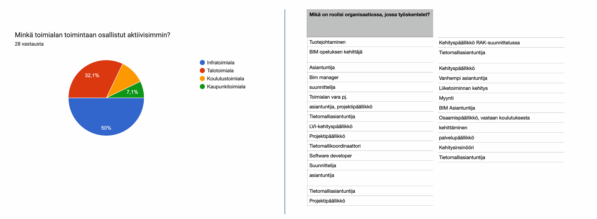 Kyselyyn saatiin 28 vastausta. Kyselyssä haluttiin taustatietona tietää minkä toimialan toimintaan vastaajat osallistuvat eniten sekä mikä heidän oma roolinsa on edustamassaan organisaatiossa. Kuvasta 1. näet, miten toimialat jakautuvat sekä millaisia rooleja vastaajilla on organisaatioissaan.