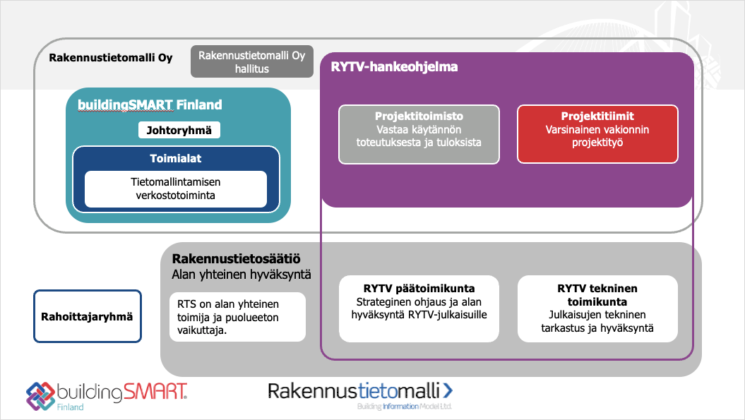 2. Uskottava RYTV-hankeohjelma on kaikille rakennetun ympäristön toimijoille. RYTV-hankeohjelma rahoitetaan ja toteutetaan alan yhteistyövoimin. Koordinoimisesta vastaa Rakennustietomalli Oy buildingSMART Finlandin tukemana.