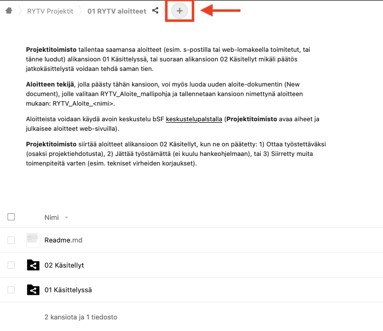 Kaikki projektialoitteet luodaan 01 RYTV aloitteet –kansioon, johon bSF:n jäsenillä on pääsyoikeus. Ethän tallenna aloitetta mihinkään kansion alakansioista.
