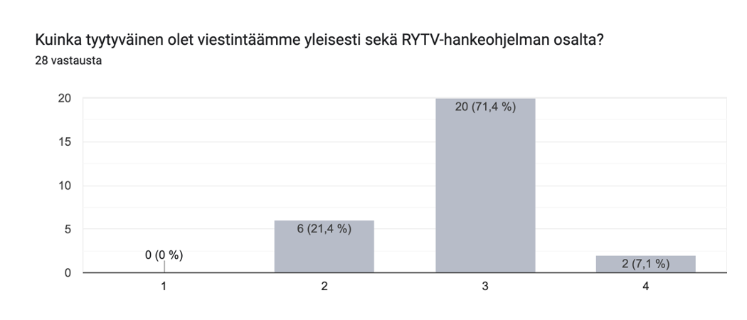 "Viestintää on tullut riittävästi. Niin paljon, että kaikkeen ei ole ehtinyt kunnolla tutustua (oma vika osittain). Tiedon välittäminen oman organisaation sisällä helpoksi. Voisi olla valmiita toimialakohtaisia kiteytyksiä tai 1-2 nostoa, jotka on helppo välittää."