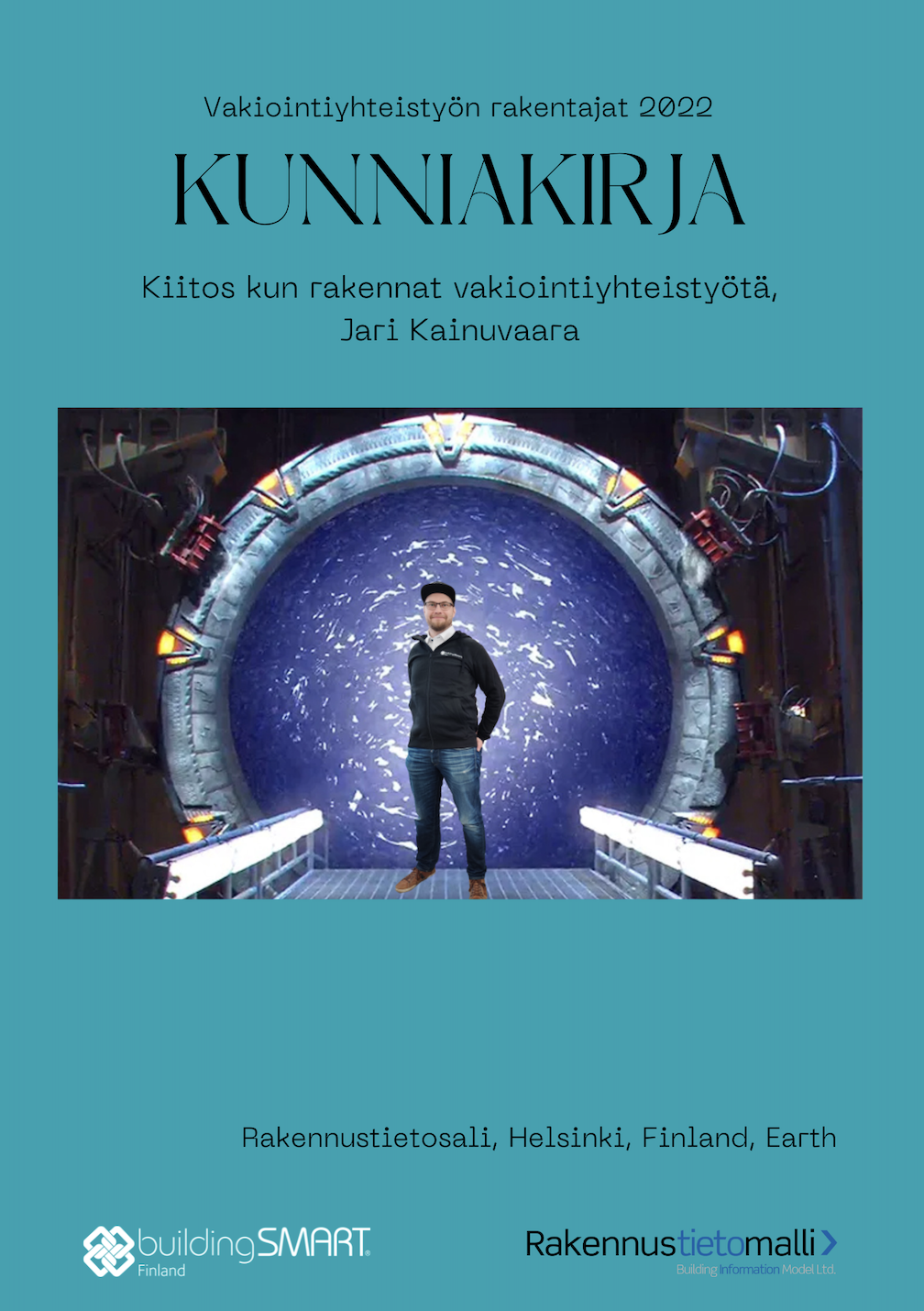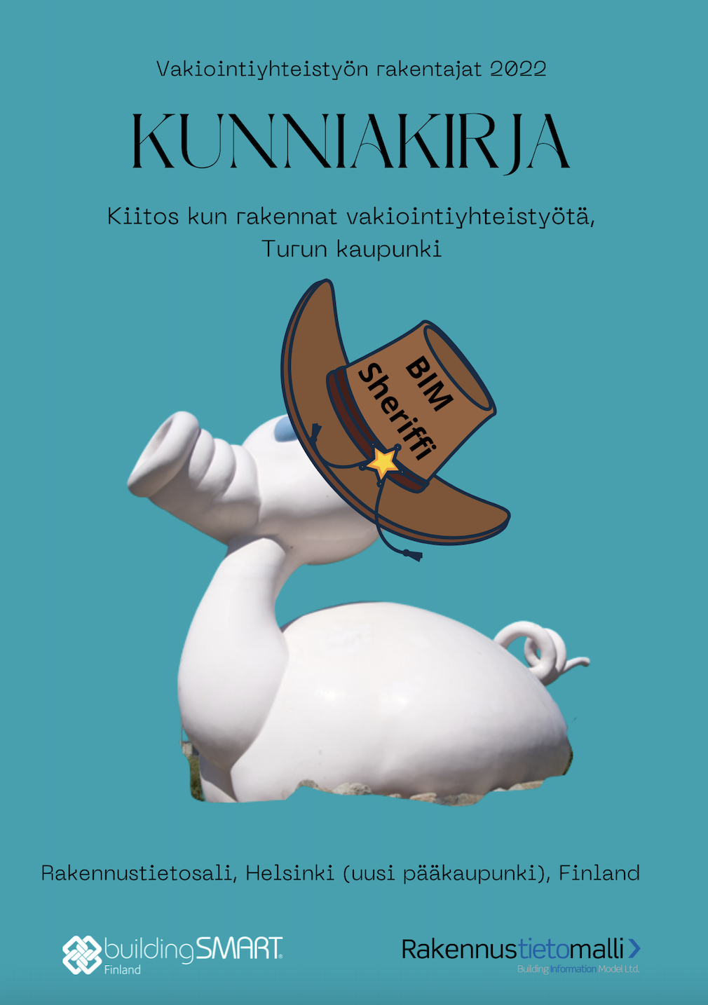 Järjestimme buildingSMART Finlandin syyskokouksen marraskuussa. Halusimme kokouksen lopussa loppukevennyksenä esittää kiitoksemme tietomallintamisen vakiointiyhteistyön edistäjille. Jaoimme kunniakirjat vakiointiyhteistyön edistäjille Jari Kainuvaaralle ja Turun kaupungille, sillä molemmat ovat osaltaan näyttäneet aktiivisuutta ja intohimoa edistää tietomallintamisen vakiointia.